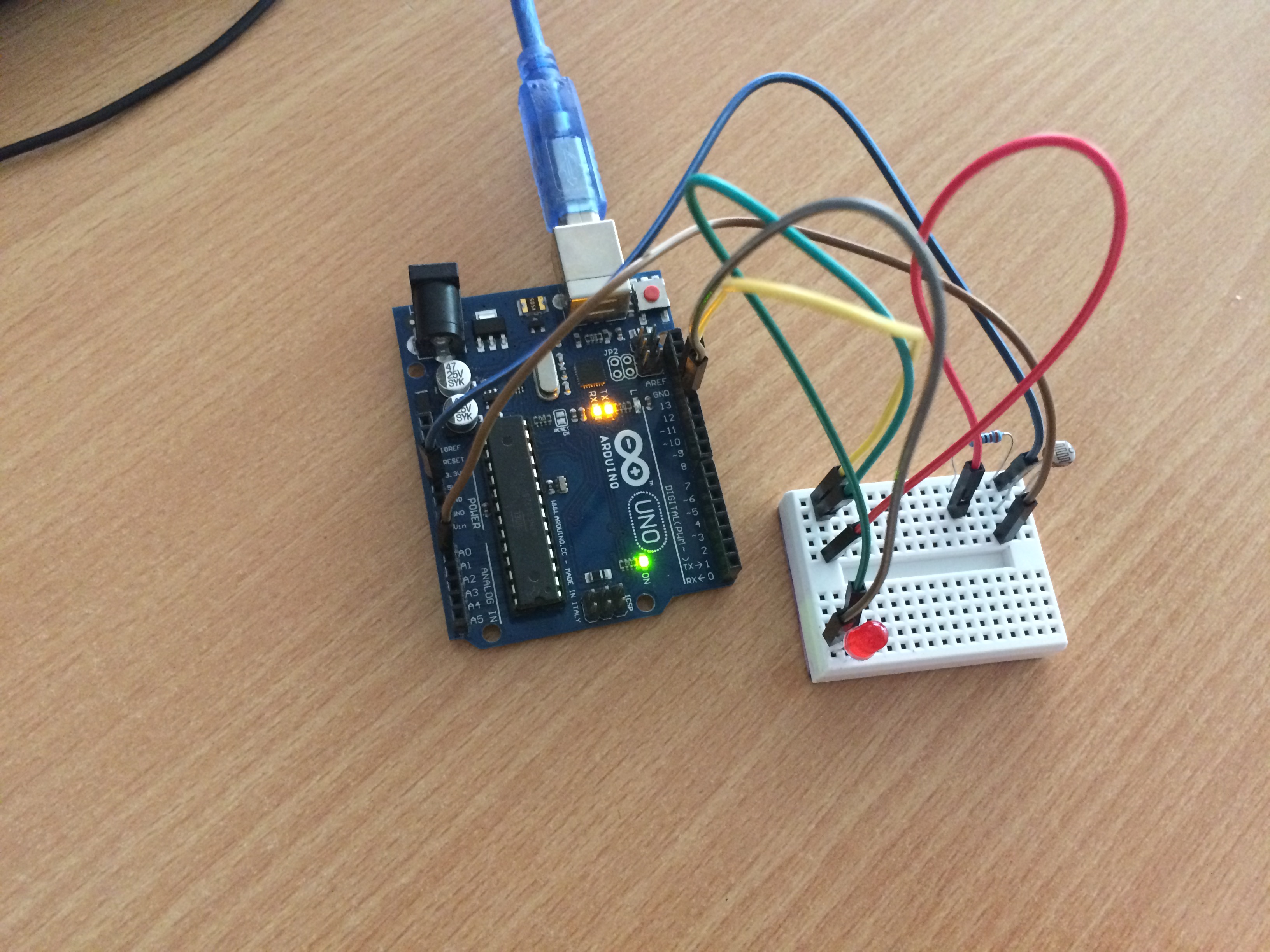 Одна ніжка фоторезистора підключається до живлення (3,5V або 5V), друга за посередництва резистора - до одного із аналогових входів плати Arduino, а друга ніжка резистора - до заземлення.