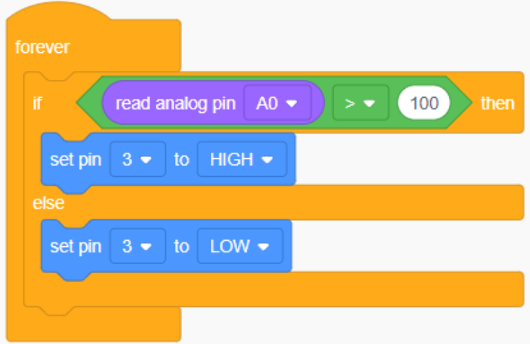 Алгоритм роботи наступний: якщо значення сенсора, що підключений до аналогового входу, 0 менше за 20, то увімкнути лампочку, інакше вимкнути лампочку.
