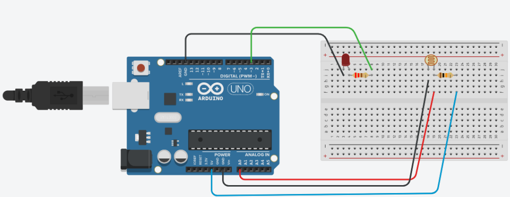Зверніть увагу на необхідність використання резистора, причому його ємність впливає на чутливість та період працездатності датчика освітлення. Для навчального проєкту це не особливо принципово, але для більших проектів проконсультуйтесь із довідковими ресурсами, наприклад http://arduino-diy.com/arduino-fotorezistor